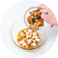 - さば缶麻婆を作る。厚揚げは1cm大の角切りにする。さば缶は身と汁を分け、身を粗くほぐす。