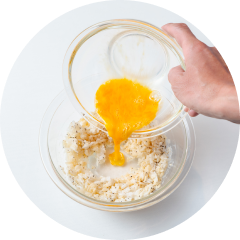 - レンジ炒飯を作る。耐熱ボウルにご飯、Aを入れて混ぜ合わせる。ご飯をボウルの縁に寄せて中央をあけ、溶き卵を加える。ラップをせずに600Wの電子レンジで2分加熱する。