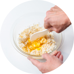 - ①を取り出し、中央の卵をそぼろ状にほぐしてから全体を混ぜ合わせる。ハム、長ねぎを加え、再び1分〜1分30秒加熱して混ぜ合わせる。