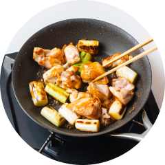 - 温めたフライパンにサラダ油を薄く引き、鶏肉を入れて中火で全体に焼き色がつくまで焼く。長ねぎを加え、全体にしっかり焼き色がつくまで焼く。