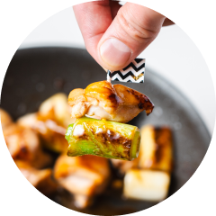 - 混ぜたAを加え、1〜2分ほど弱火で煮からめる。火を止め、弁当箱のサイズに合わせてピックなどで刺して焼き鳥状にする。