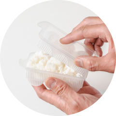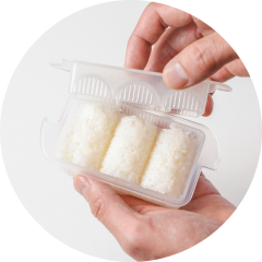 ご飯は100円ショップの型を使って俵形にすれば、みんなで取り分けやすいシェアご飯に。型にご飯を詰め、ふたをしてしっかり押さえたら、取り出して軽く形をととのえます。