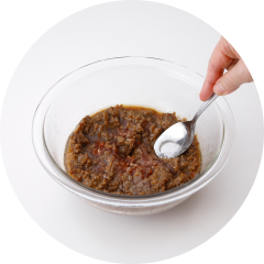 - スプーンの背で肉をほぐしながら混ぜ、再び2分加熱して同様によく混ぜる。これをもう一度くり返す。