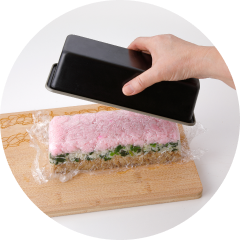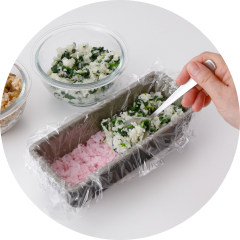 - 深さ6㎝程度の長方形の保存容器(またはパウンドケーキ型など)の中にラップを敷き、桜でんぶご飯、ほうれん草のナムルご飯、肉そぼろご飯の順に平らに詰める(上からラップをかぶせて軽く押すことで型崩れを防ぐ)。食べる直前に皿の上にひっくり返し、ラップをはずして切り分ける(現場で切るのが難しい場合は一度取り出して切ってからまた容器に戻す)。