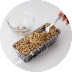 - 深さ6㎝程度の長方形の保存容器(またはパウンドケーキ型など)の中にラップを敷き、桜でんぶご飯、ほうれん草のナムルご飯、肉そぼろご飯の順に平らに詰める(上からラップをかぶせて軽く押すことで型崩れを防ぐ)。食べる直前に皿の上にひっくり返し、ラップをはずして切り分ける(現場で切るのが難しい場合は一度取り出して切ってからまた容器に戻す)。