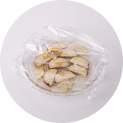- さつまいものレモン煮を作る。さつまいもは皮つきのまま7~8mm幅の半月切りにし、水にさらす。レモンは4等分に切る。耐熱皿にすべての材料を重ならないように入れ、ふんわりとラップをかけ、600 Wの電子レンジで3分~3分30秒加熱する。レンジから取り出してラップを表面に密着させ、そのまま1~2分蒸らす。